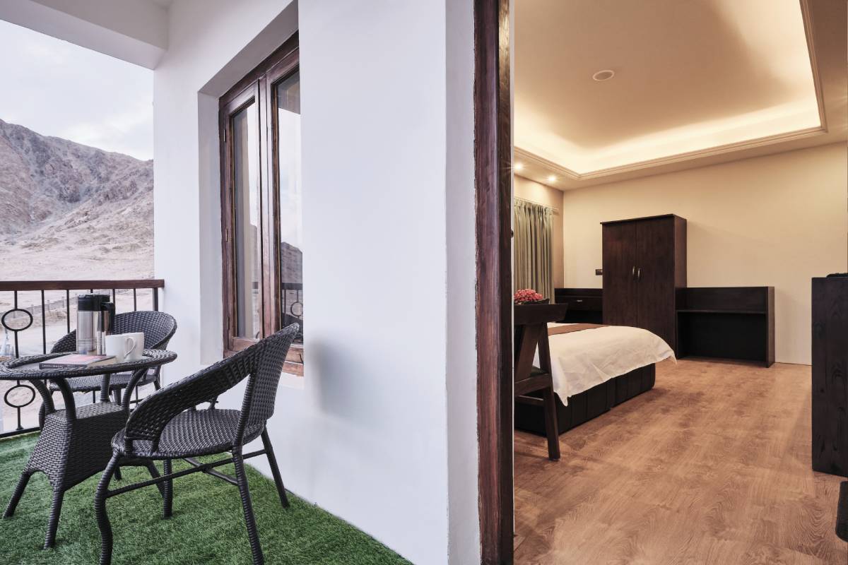 +91-9419231329The Deluxe Room with Balcony offers a perfect blend of comfort and stunning views. Guests can step out to their private balcony to enjoy the crisp mountain air and panoramic landscapes of Ladakh. Inside, the room features cozy bedding, warm interiors, and essential amenities, making it an ideal space to relax after a day of exploration.